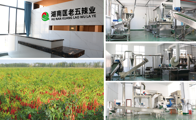 湖南匡老五辣业食品科技有限公司,是一家集农产品开发、销售及专业辣椒种植、生产、加工为一体的全产业链企业,公司正式成立于2020年4月,座落于耒阳市经济开发区创新创业园,前期投资1000万元,公司及工厂使用面积4000平方米,包含2000立方米保鲜冷库一座,标准规模化精、净干辣椒系列产品及香辛料生产线8条,年产量可达6000吨,年产值过亿元。